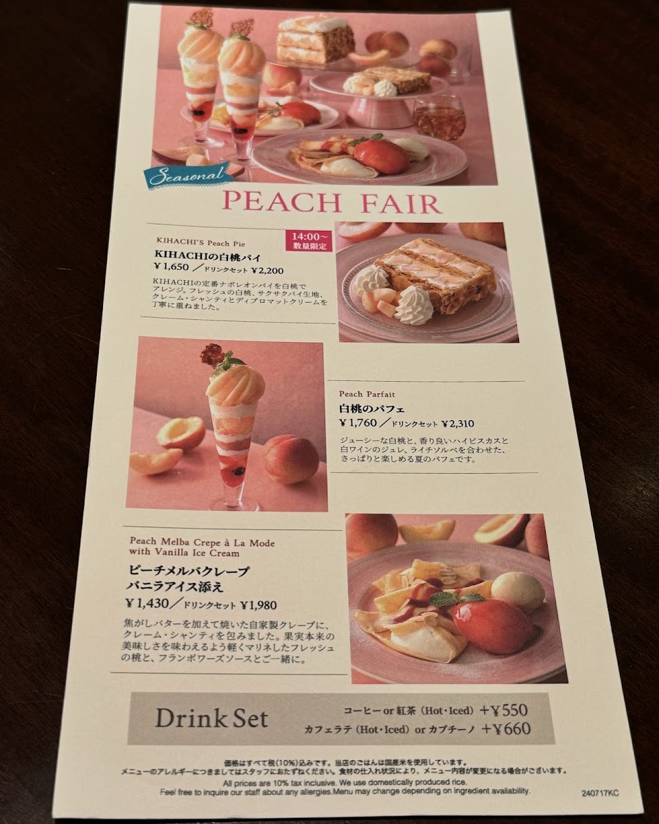 - Teas: Savor their original blended tea—perfectly paired with cakes—or choose from a range of Earl Grey and iced tea options, each priced at JP¥770.